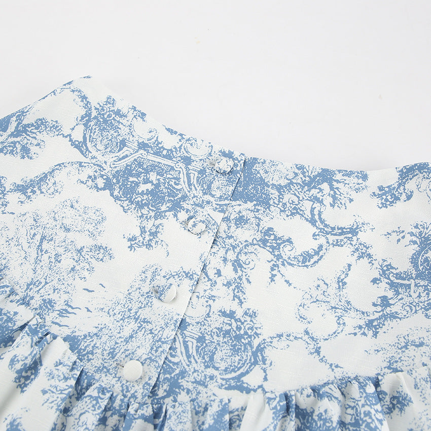 Lamoderoyale™ | Bleu Toile Takım – 2 Parça Vintage Desenli Mini Etek & Gömlek Seti