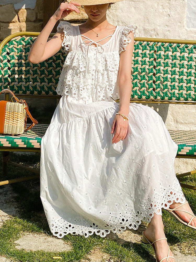 - Etek ve kol uçlarında broderie anglaise (ajur) detay