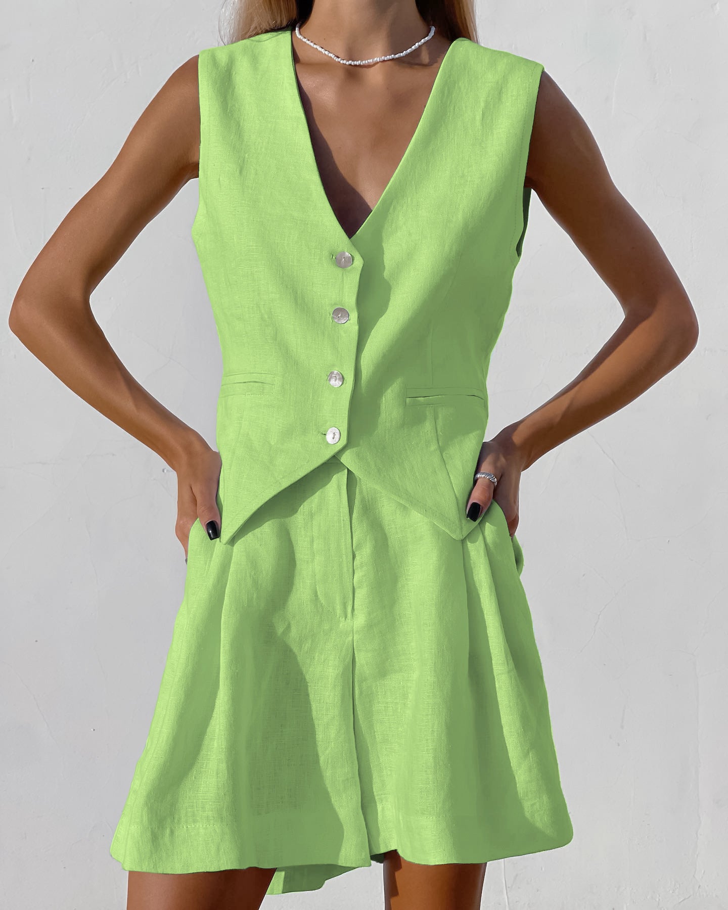 LinenCool Yazlık Takım, %95 ve üzeri pamuk-keten karışımı kumaşıyla yaz aylarının vazgeçilmezi olmaya aday. Takım halinde gelen bu ürün, dökümlü şortu ve vücuda oturan yelek kesimiyle hem gündelik kullanıma hem de şık yaz akşamlarına uygundur.