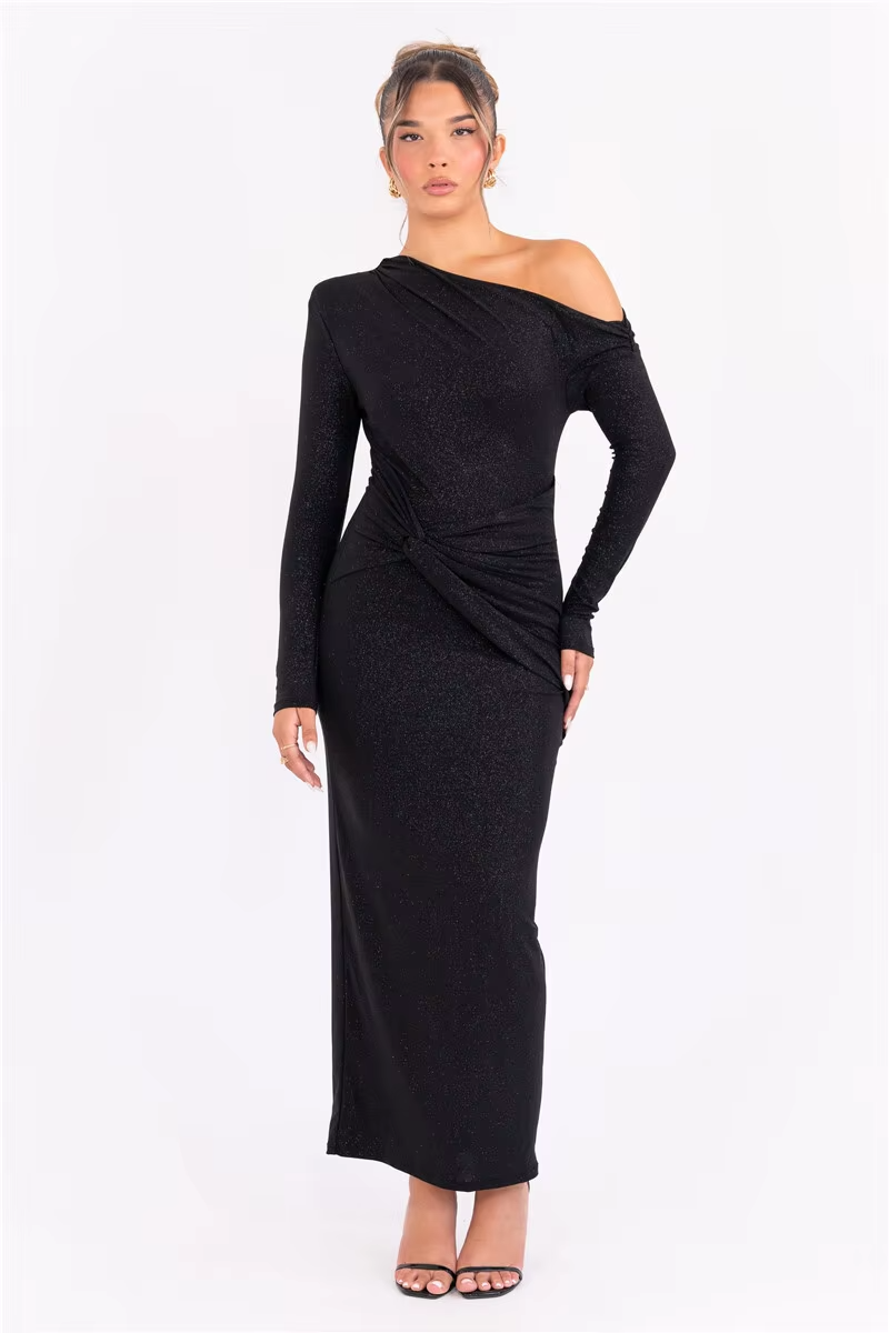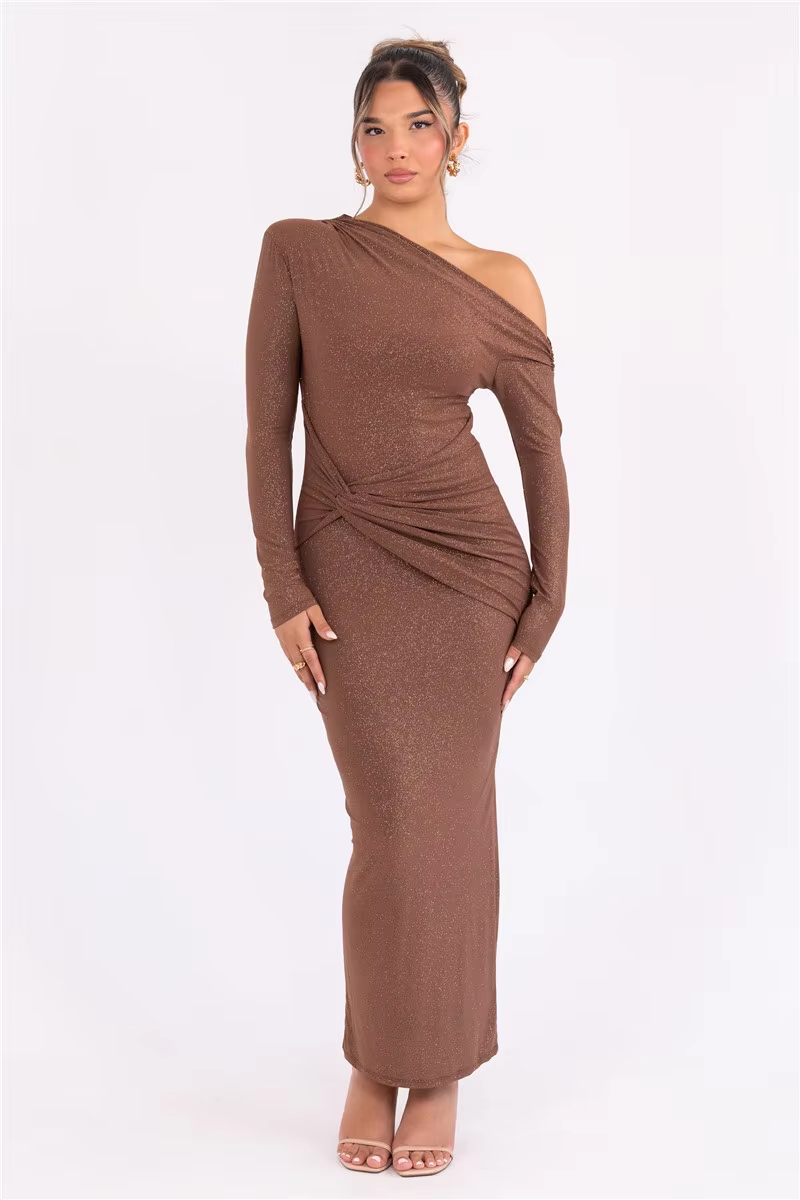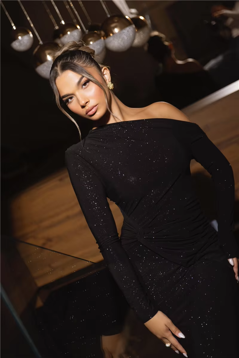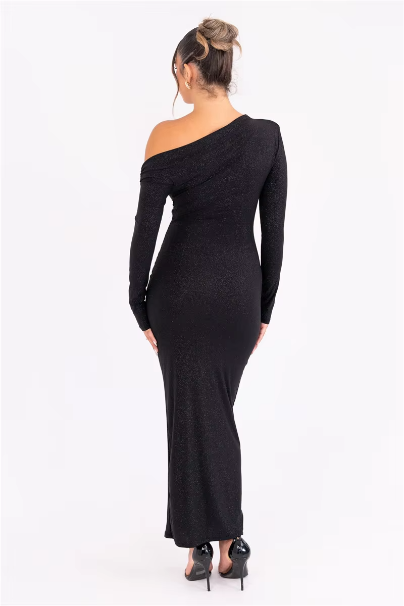 Tek omuz detayı cesur bir dokunuş katarken, maxi elbisenin ışıltılı yapısı ışığı zarifçe yansıtarak etkileyici bir görünüm yaratıyor.
